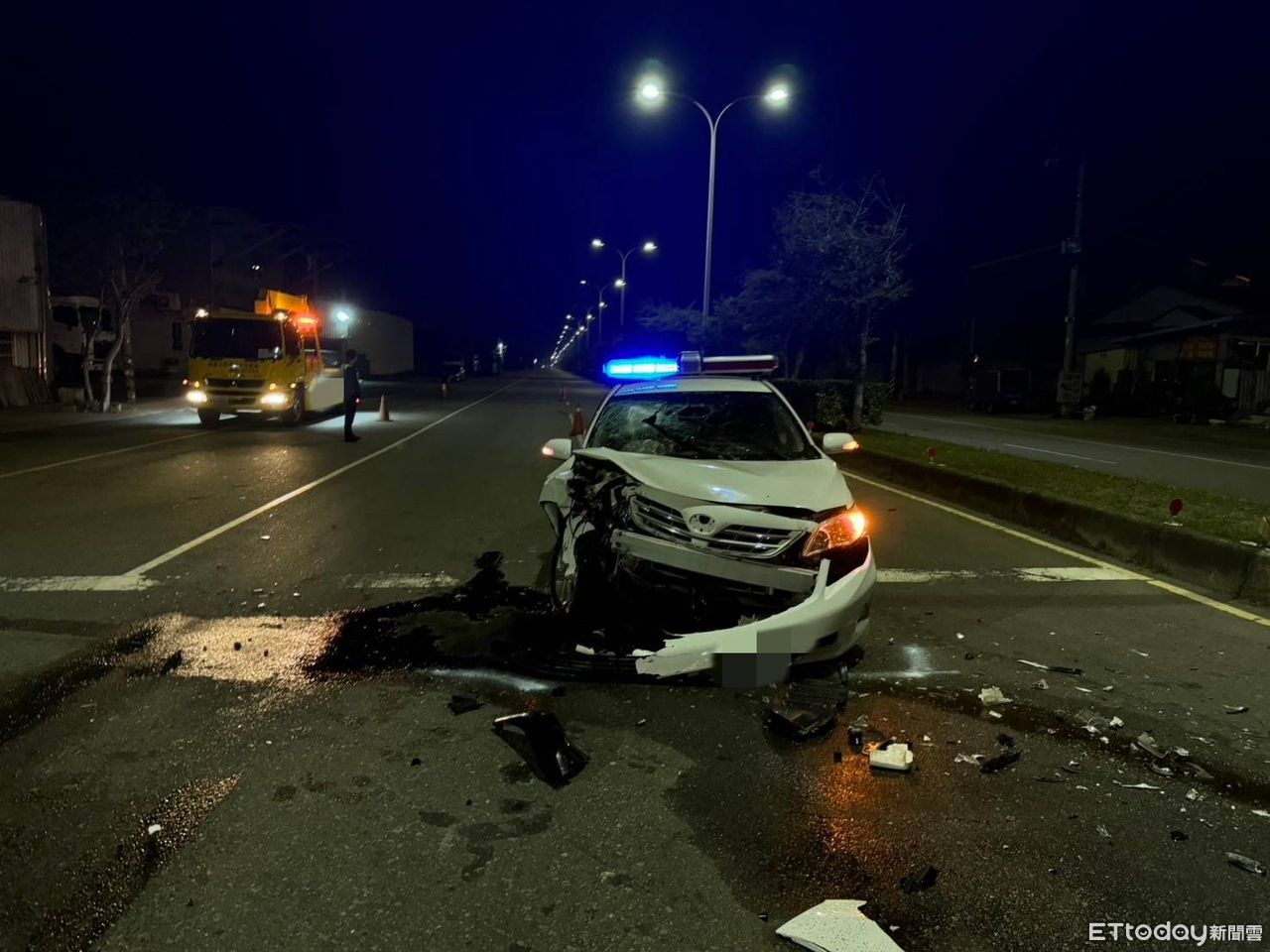 ▲台中市龍井區田中里守望相助隊巡邏車昨晚遭一名吳姓毒犯撞爛。(圖/記者許權毅翻攝,下同)