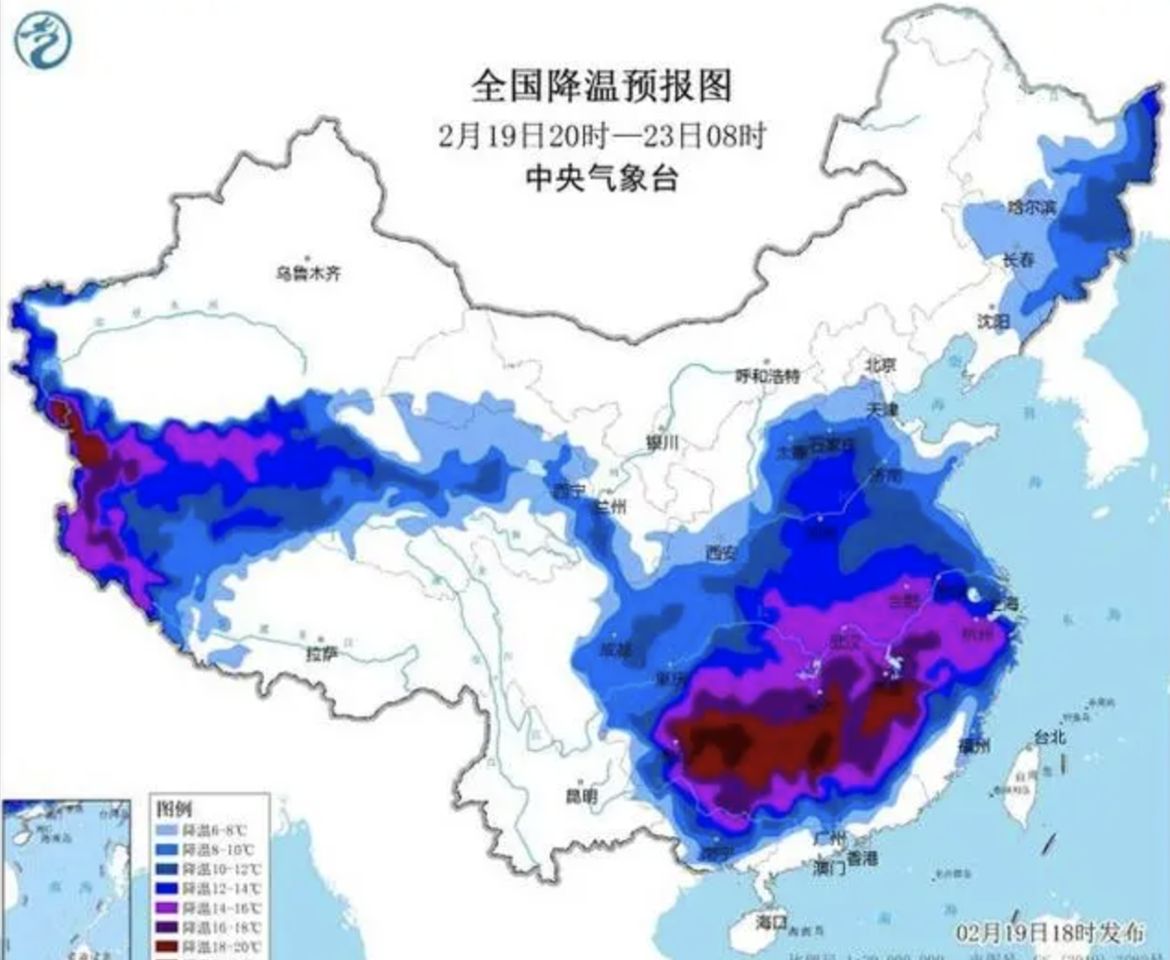 《中國日報網》報導,預計,2月19日20時至2月22日20時,我國中東部大部將自北向南先後出現降溫,日平均或最低氣溫普遍下降8~12℃,華北南部、黃淮西部、江淮、江漢、江南、華南中北部及貴州等地氣溫將下降12~18℃,其中,湖南南部、貴州東部等地的部分地區累計降溫幅度可達20℃以上。2月23日前後,最低溫度0℃線將南壓到蘇皖南部至湖南南部、貴州南部一帶。