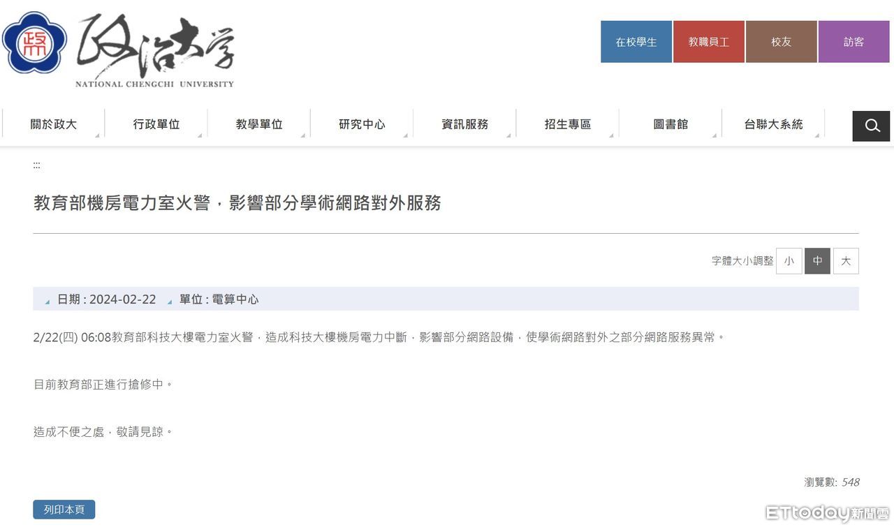 另政大則在學校網站公告,指今天早上6時8分,因為教育部科技大樓電力室火警,造成科技大樓機房電力中斷,影響部分網路設備,使學術網路對外部分網路服務異常。目前教育部正進行搶修中,造成不便之處,敬請見諒。