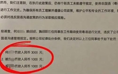 近期,該間公司有3名員工在工作時間內以粵語進行交流,遭到公司內部調查,並被認定違反了國語溝通管理行為,其中2人被罰款1000元,1人被罰款3000元,共計5000元。
