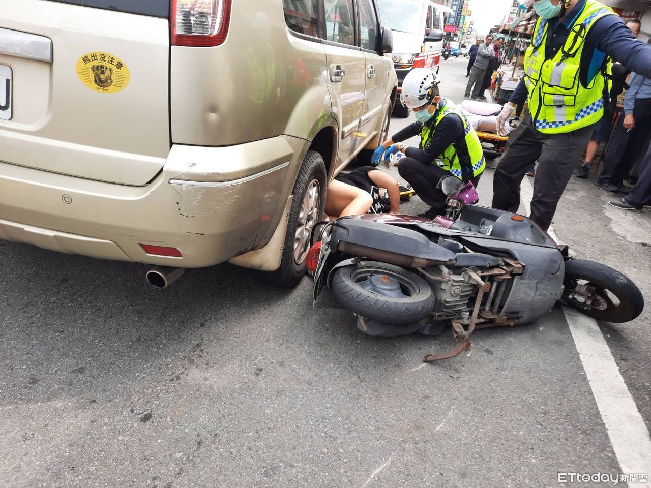 ▲苗栗縣苑裡鎮為公路休旅車擦撞機車,機車騎士摔倒後滑入休旅車車底,51歲女騎士手腳擦挫傷。(圖/記者蔡文淵翻攝)