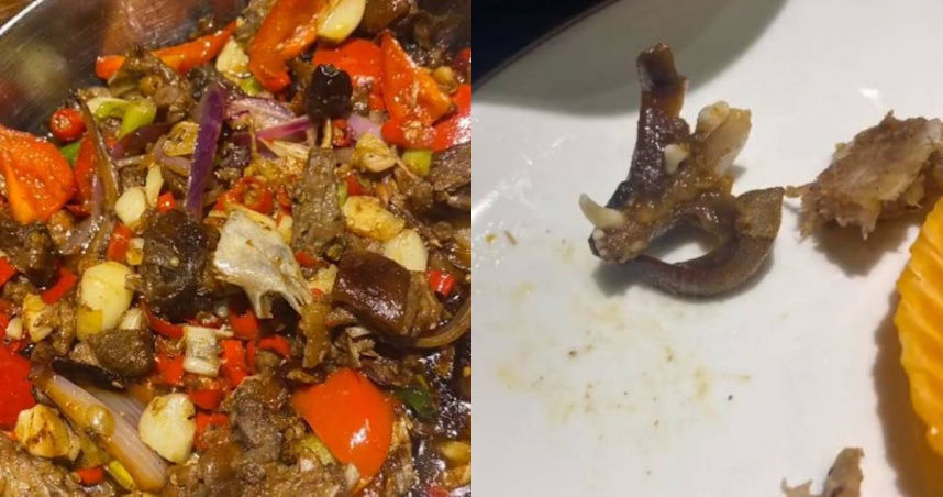 根據陸媒報導,廣西一名網友到餐廳用餐點了一份「乾鍋兔肉」,結果吃到一半時發現鍋中夾到一塊頭骨,且怎麼看都不像兔子的,反倒是像貓的頭,甚至還有牙齒在上面,懷疑店家將貓肉混充兔肉,還說自己預計下個月要去領養小貓,已被這頓飯噁心到了。
