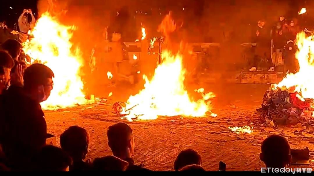 ▲苗栗火旁龍系列活動最後儀式「化龍返天」,26日晚上在苗栗市五文昌廟進行,現場火焰沖天,大家恭送龍神返回天庭。(圖/記者蔡文淵翻攝)