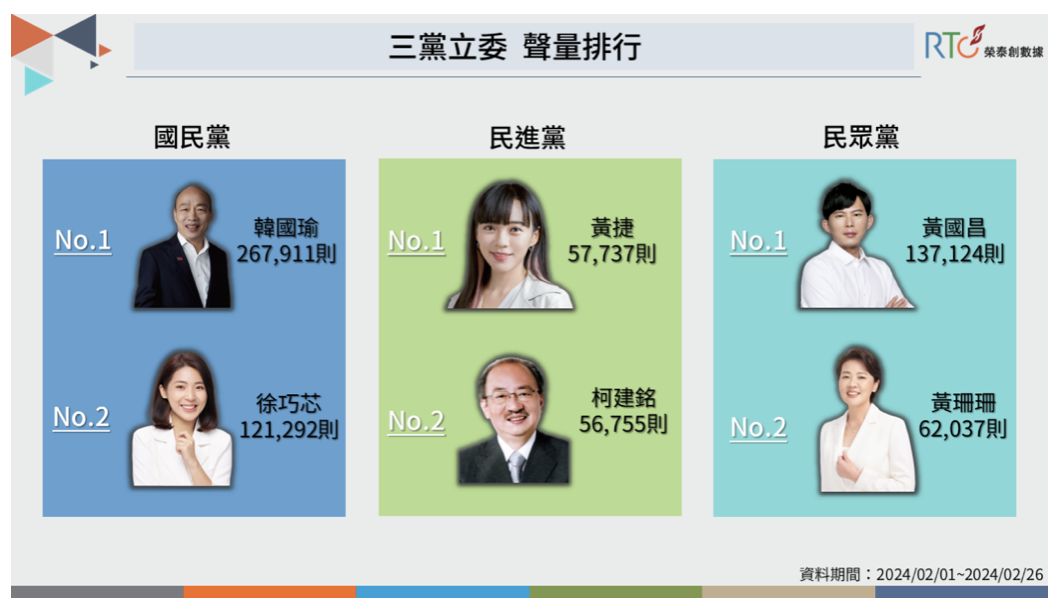 進一步觀察三黨各自立委的個別表現,榮泰創數據指出,國民黨由韓國瑜以26.7萬則聲量一枝獨秀,重砲級戰將徐巧芯12.1萬位居第二;團體聲量居首的民進黨,個別立委的成績卻未有突出表現,反而呈現相對均衡的戰力團隊,其中由新科立委黃捷以5.7萬則聲量脫穎而出,與聲量達到5.6萬則的「萬年總召」柯建銘的表現相差無幾。