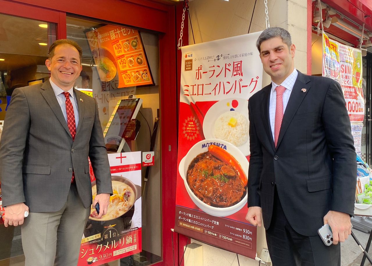 根據日媒《日刊體育》,日本跨國日式快餐連鎖店「松屋」從今年2月20日起推出別具波蘭風味的「絞肉漢堡排」(ミエロニィハンバーグ)、以及以喬治亞傳統燉烤雞料理「奇克美露里」,在日本境內48間店鋪販賣,然而卻意外吸引到兩國大使特地前來用餐,松屋也在社群媒體證實消息。