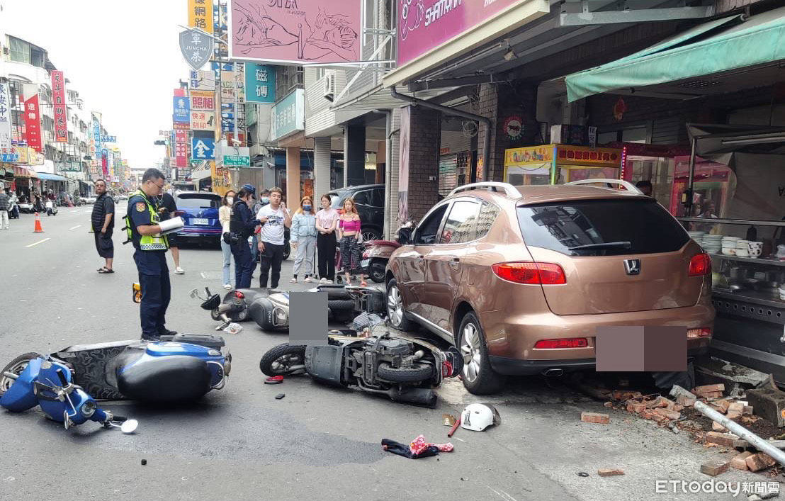 ▲鳳山一台休旅車疑似爆胎衝撞路邊4攤販和9台機車。(圖/記者陳宏瑞翻攝)