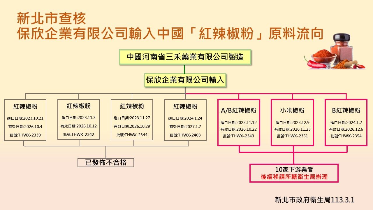蘇丹紅辣椒粉流竄全台,整起案件源頭輸入業者保欣公司累積共有7批辣椒粉檢出禁用蘇丹色素三號,其中最新檢出的3批辣椒粉販售給下游10家業者,正移請各地方衛生局調查。新北市衛生局今(1)日晚間也宣布,保欣立即停止販售辣椒粉相關產品,並依計畫進行回收違規原料,後續要提交檢討報告通過審核才能恢復販賣。