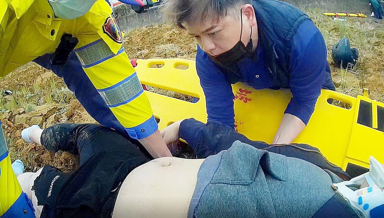 ▲桃市義消總隊平鎮中隊復旦分隊隊員黃章珷(左一)2月底下班途中遇到車禍,秒調頭協助解救傷患。(圖/桃市消防局提供)