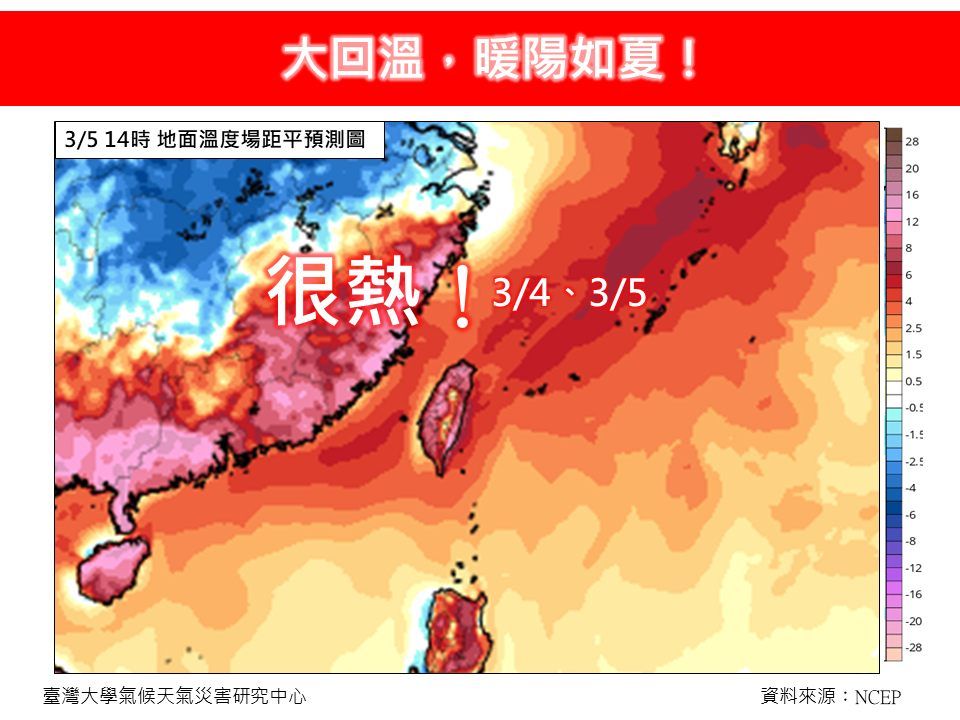 林得恩說,根據今晨最新美國NCEP數值模式模擬結果,周一、周二由於環境轉為南風到西南風,全台氣溫更加顯著回升,水氣偏少,各地多為多雲到晴的穩定天氣,彷若夏天;中南部局部地區高溫甚至有機會衝到33度或以上,尤其在近山區或河谷地區還可能更高個1至2度。