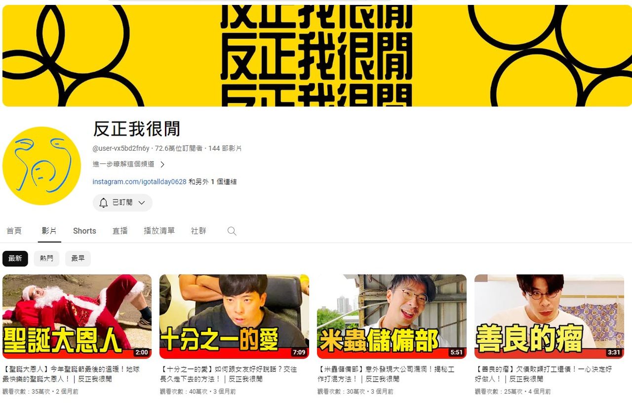 ▲「反正我很閒」擁有72.6萬人訂閱。(圖/翻攝自YouTube/反正我很閒)