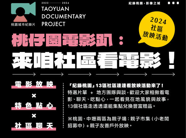 本次社區放映活動,以桃園市13區各自不同的議題、文化脈絡安排適合的紀錄片,類別涵蓋了動畫、電影、紀錄片、短片及長片等不同類型,一一走進13個社區,透過不同影像,看見彼此的多元風貌。
