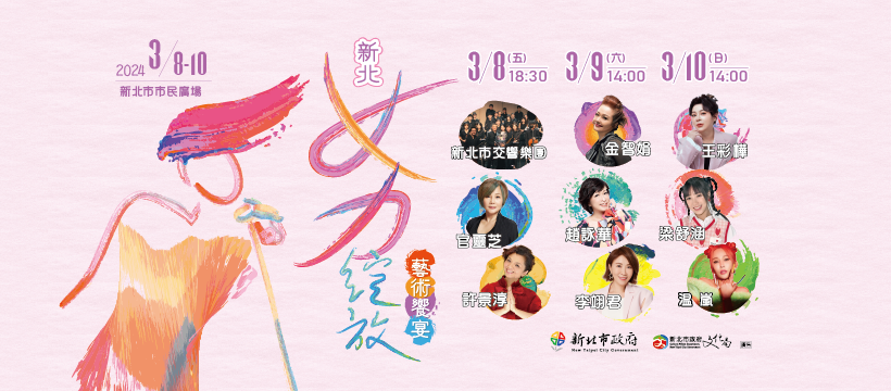 3月8日是一年一度的國際婦女節,在這個專屬於女性的節日,新北市政府於3月8日至3月10日在新北市政府市民廣場,將舉辦「新北女力綻放藝術饗宴」活動與市民朋友一起歡度婦女節,邀請新北市交響樂團以及眾多天后級歌手:官靈芝、許景淳、金智娟、趙詠華、李翊君、王彩樺、梁舒涵及温嵐等重量級演唱會卡司,帶來美聲及動感的精采演出!