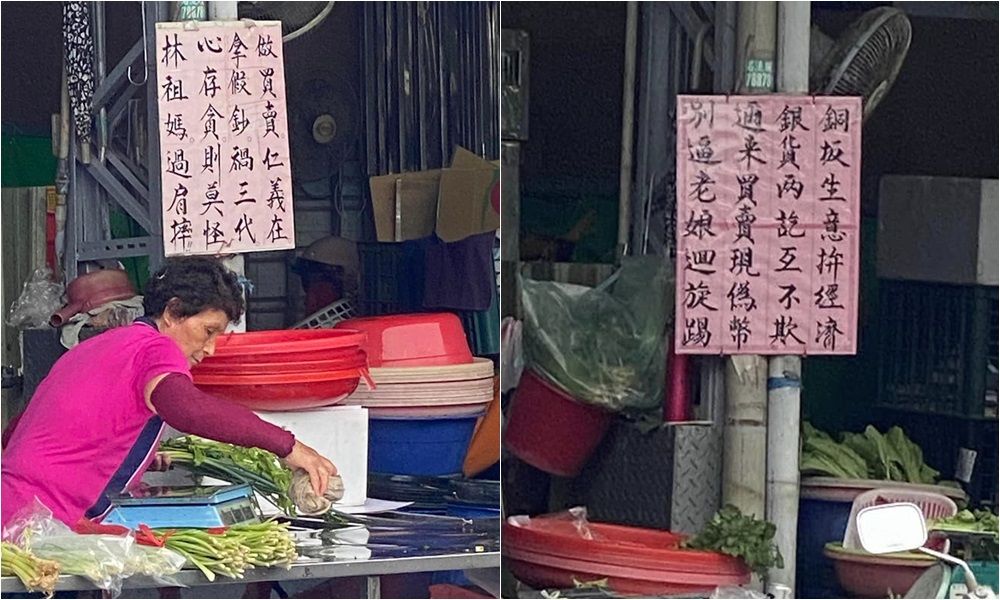 「阿婆真的很可愛,知道有粉絲關注,還會更新警語。」有網友在「路上觀察學院」貼出兩張照片,只見菜市場中有菜攤擺出牌子,警告「假鈔族」不要欺騙。不只內容有趣、字跡好看,店家還定期更新警語,引發眾人熱論。