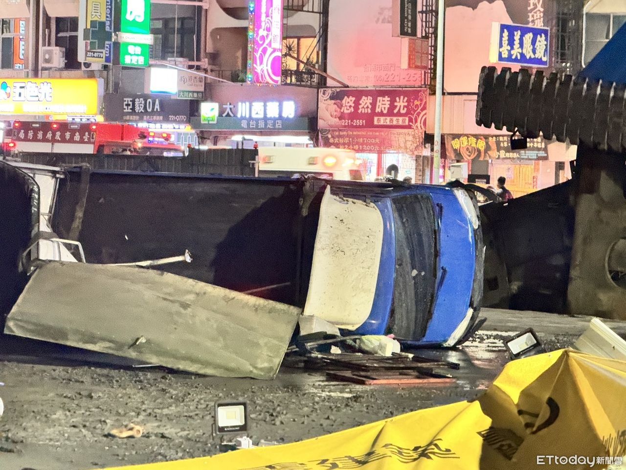 相關單位指出,台南市中西區五妃街和西門路一段的交叉路口附近新建工地,晚間8點24分據報有地層塌陷,隨即派遣4車8人前往,證實有車子及現場施工吊車翻覆情形,所幸無人員受傷受困,目前各局處在現場人車警戒中。