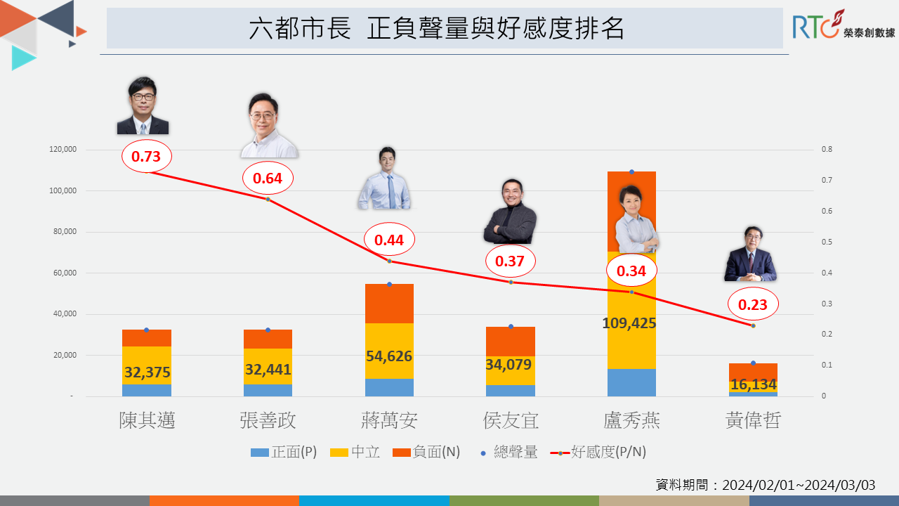 《榮泰創數據》今(7)公布「六都燈會聲量」調查報告,觀察最近1個月六都市長的好感度表現,前段班分別是高雄市長陳其邁(0.73)與桃園市長張善政(0.64)。其中陳其邁透過黃色小鴨活動掀起旋風,發展演唱會經濟也提升年輕族群好感,被譽為「城市行銷之王」;張善政在交通建設、道路改善方面施政進展顯著,包括中央助攻核定桃捷棕線、綠線延伸中壢,因此獲得民眾肯定。