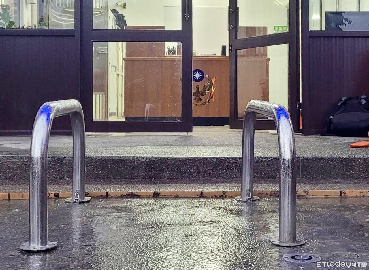 ▲八堵分駐所員警遭撞殉職,6日在門口裝上防撞鋼架 。(圖/記者郭世賢翻攝)