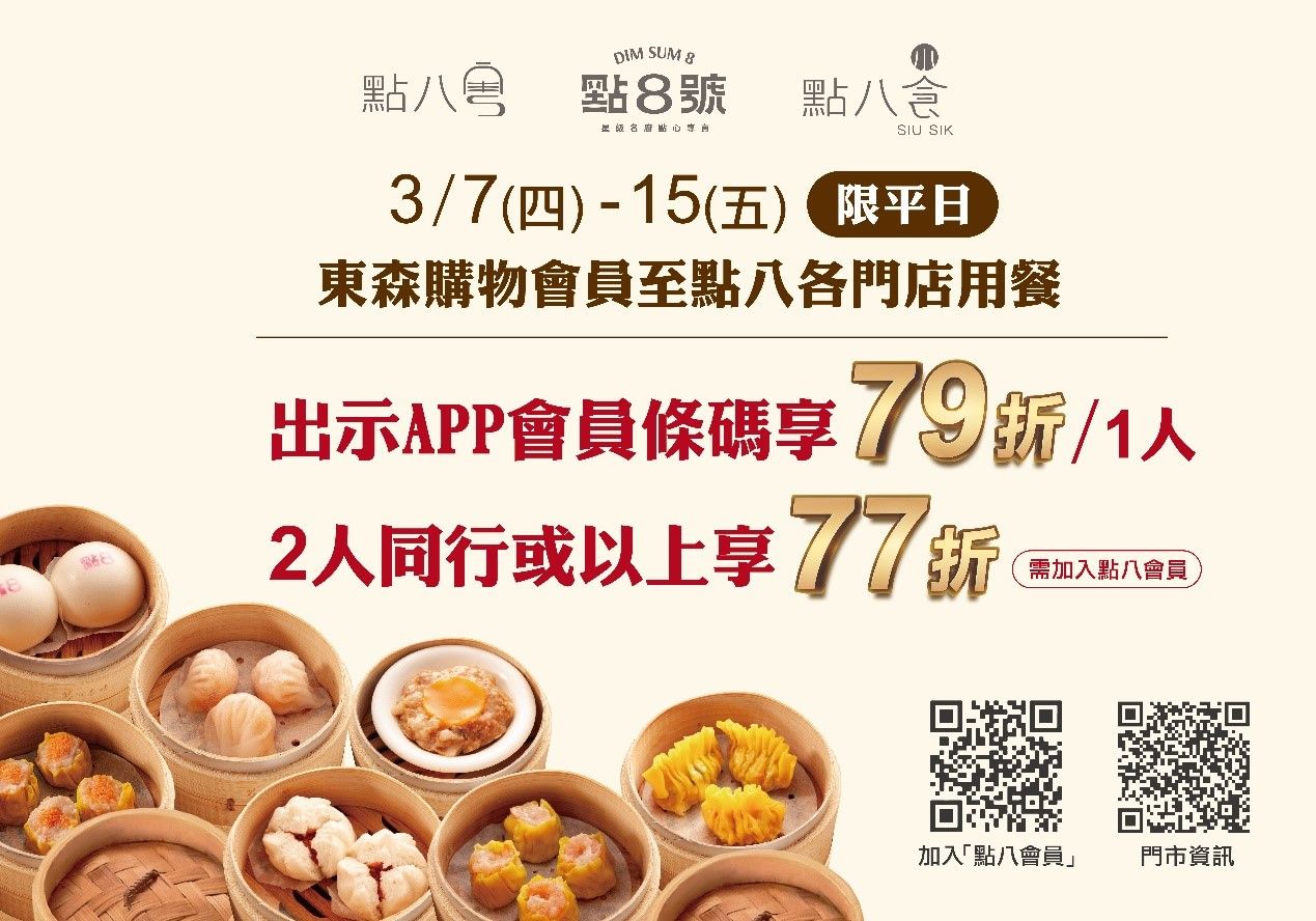 港式餐飲龍頭「點八餐飲集團」攜手台灣知名電商平台東森購物,將於3月7日至15日平日期間舉辦獨家優惠活動,凡是東森購物的會員,只需出示東森購物APP上的會員條碼,並加入點八會員,即可在點八各門店享79折優惠,2人或以上同行用餐,更可享77折超值折扣。