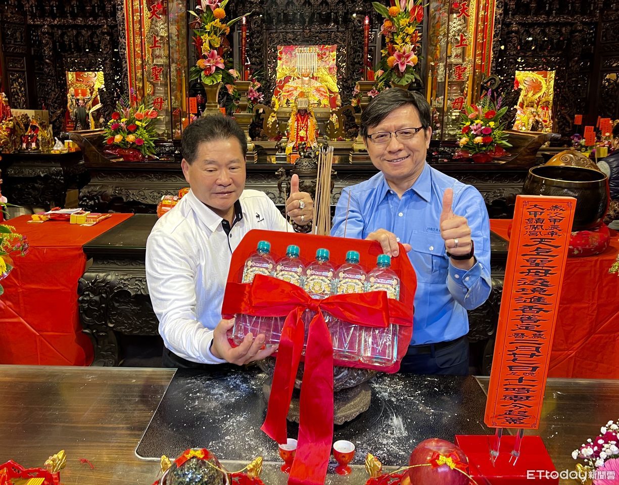 ▲台鹽公司總經理陳世輝(右)與鎮瀾宮副董事長鄭銘坤,共持台塩海洋鹼性離子水大甲媽聯名祈福瓶過爐,祈求遶境活動順利。(圖/記者林東良翻攝,下同)