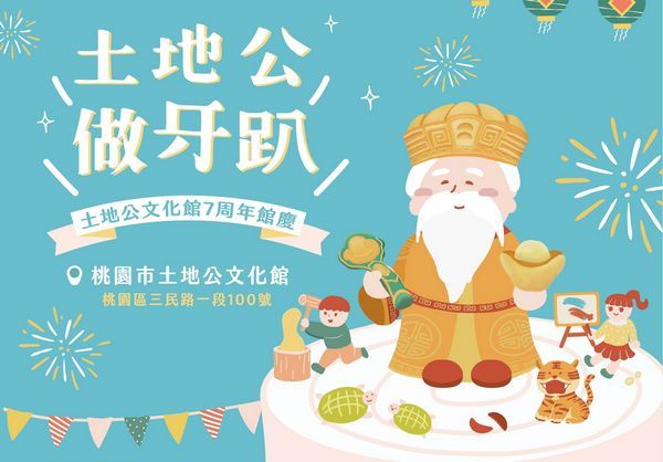 桃園市土地公文化館今年成立七周年,將於3月9、 10日兩天,結合慶祝農曆二月初二「土地公生」,於土地公文化館廟埕舉辦館慶「做牙趴」,安排各種熱鬧活動來為土地公暖壽,有多項親子手作體驗、表演及寫生活動,邀請市民朋友作伙鬥鬧熱!