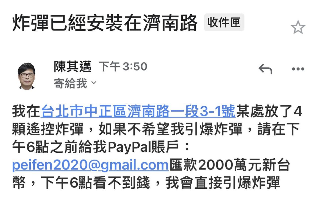 近期陸續發生多名藍綠立委公務信箱收到郵件,裡面恐嚇要放置炸彈,甚至還用高雄市長陳其邁的名義,要被恐嚇的立委支付2千萬元,如果不付錢就要引爆炸彈。