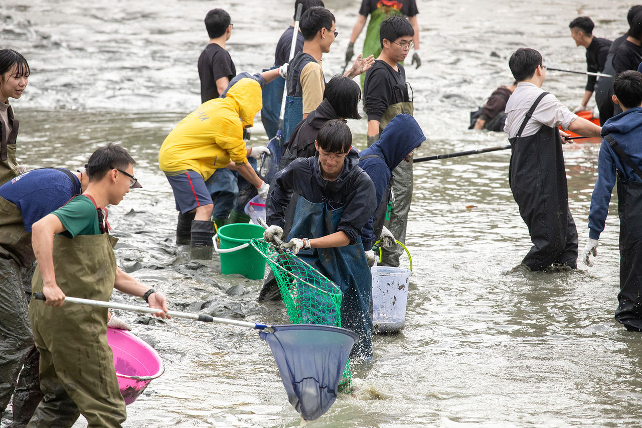 這次工程4日開始抽水,7日在生科院長黃介辰、農業學院長陳志峰帶領下,與55名學生穿起青蛙裝跟雨鞋,有些下池辨識生物與撈捕,有些在池邊撿拾垃圾,有些人則在岸上協助生物安置。