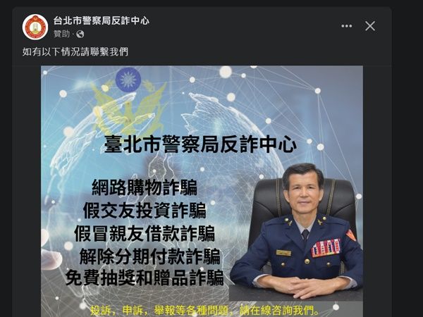 有網友在PTT以「台北市警察局反詐中心在線為您服務」為題發文表示,他在臉書上看到有詐騙集團假冒「台北市警察局反詐中心」開設粉專,圖片上提及會解決網購詐騙、交友投資詐騙等,甚至在文末說,「已經幫助12685名市民處理了」。