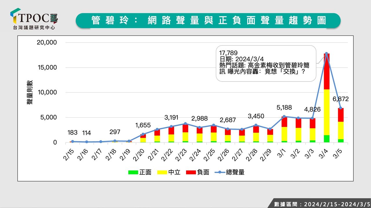 TPOC台灣議題研究中心9日公布金門快艇案發生後的網路輿情聲量數據,管碧玲在立法院開議後,網路聲量持續飆增,三無船舶翻覆事件發生前5天的單日網路聲量不超過300則,2月20日開議日當天一舉超過千則,隨後網路聲量居高不下,在立法院內政委員會「金門撞船案」專題報告當天飆破1.7萬則。