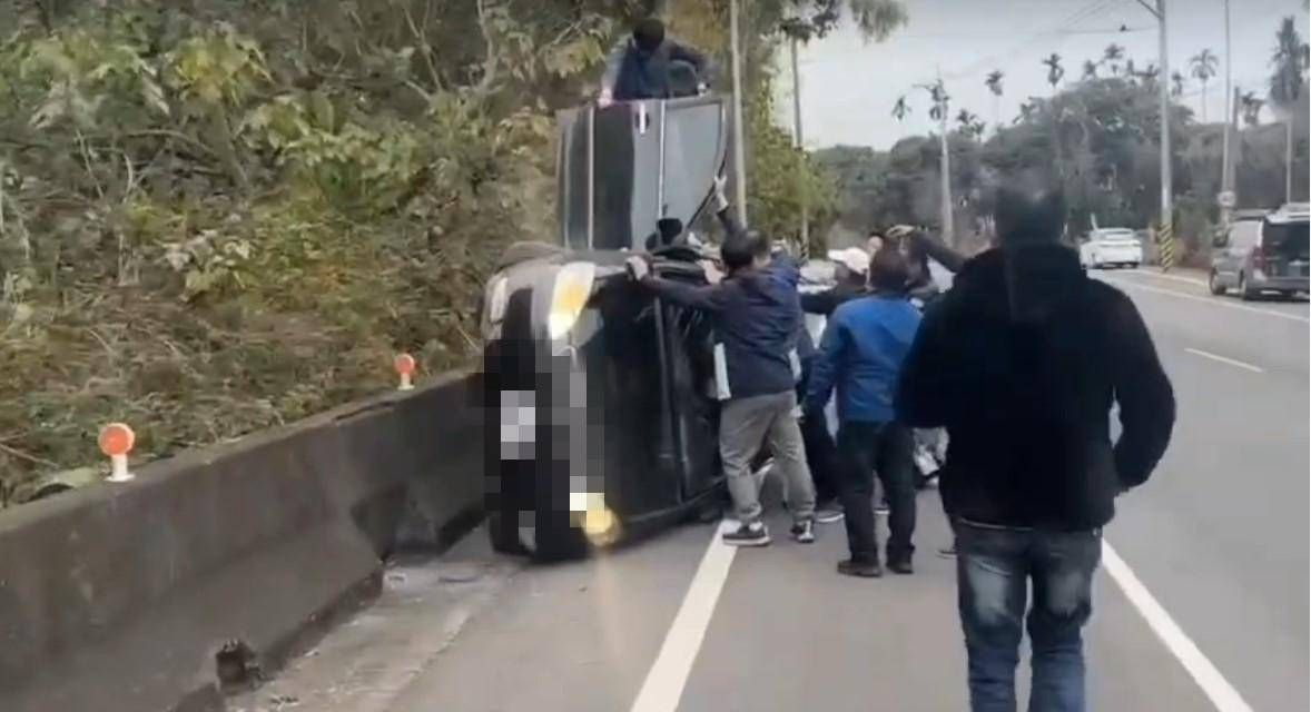 翻車事件發生在今天15時51分許,這輛自小客不明原因突然翻車,嚇壞不少用路人,當時車內陳姓駕駛正載著男子要前往南投遊玩,卻在17K處自撞護欄,側翻成90度,路人見狀有的搬來鋁梯、有的還將副駕駛座車門打開,將男子從車內救出。