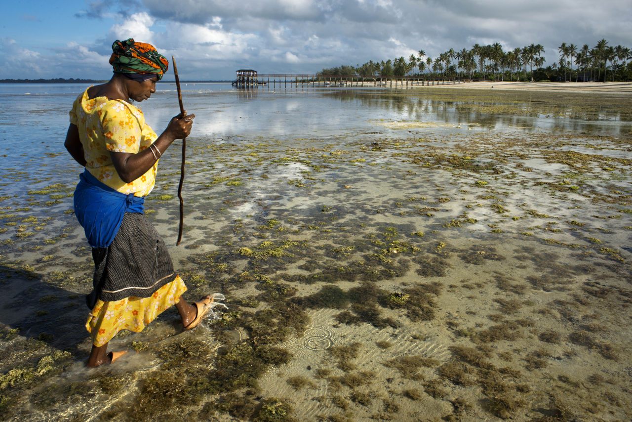 ▲尚吉巴群島(Zanzibar)一名婦女趁著退潮時採集海草與軟體動物。(圖/達志影像/美聯社)