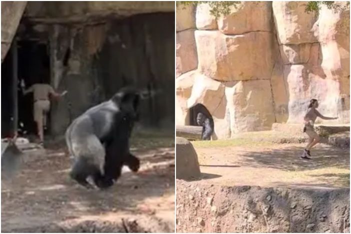 美國德州沃斯堡動物園(Fort Worth Zoo)上演驚險一幕,動物展示區一隻大猩猩突然在工作人員後方加速奔跑,直到被食物桶卡到才停下來,然而一抬頭就與工作人員正面對峙。這段影片的瀏覽次數至今衝破1400萬次,可聽見現場遊客見狀不斷發出驚呼聲,直喊「老天爺幫幫她」。