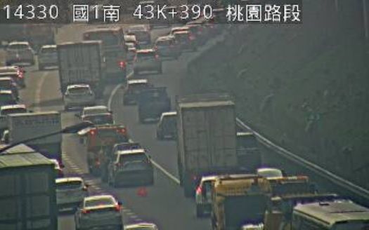 國道1號北向43K桃園路段今(11日)上午7時55分許傳出事故,現場2部小客車追撞,占用外線車道,由於適逢周一上班車潮,現場車流回堵約5公里,目前事故尚在處理中,籲請用路人小心慢行。