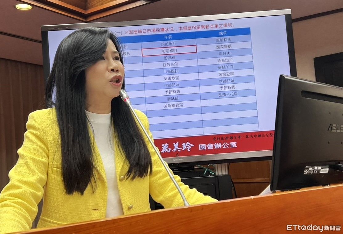 萬美玲質詢指出,蘇丹紅風暴延燒,波及辣椒粉、咖哩粉、胡椒粉、沙茶醬等調味料,學校營養午餐都已經宣布禁用辣椒粉、咖哩粉,部分縣市也禁用胡椒粉,但從國訓中心菜單顯示,還有椒麻雞、咖哩豬肉、泡菜豬肉等料理,強調國手和學生健康一樣重要,要求教育部立即要求國訓中心禁用。