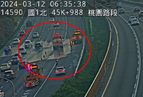 上班快改道!高公局表示,今天凌晨2時44分,國道1號北向45.8K、桃園路段,發生一輛大貨車事故占用外線及外路肩車道,現場清理拖吊中,後方回堵3公里,請用路人提前避開壅塞路段,小心行駛。而截至今早6時35分,事故仍未排除。