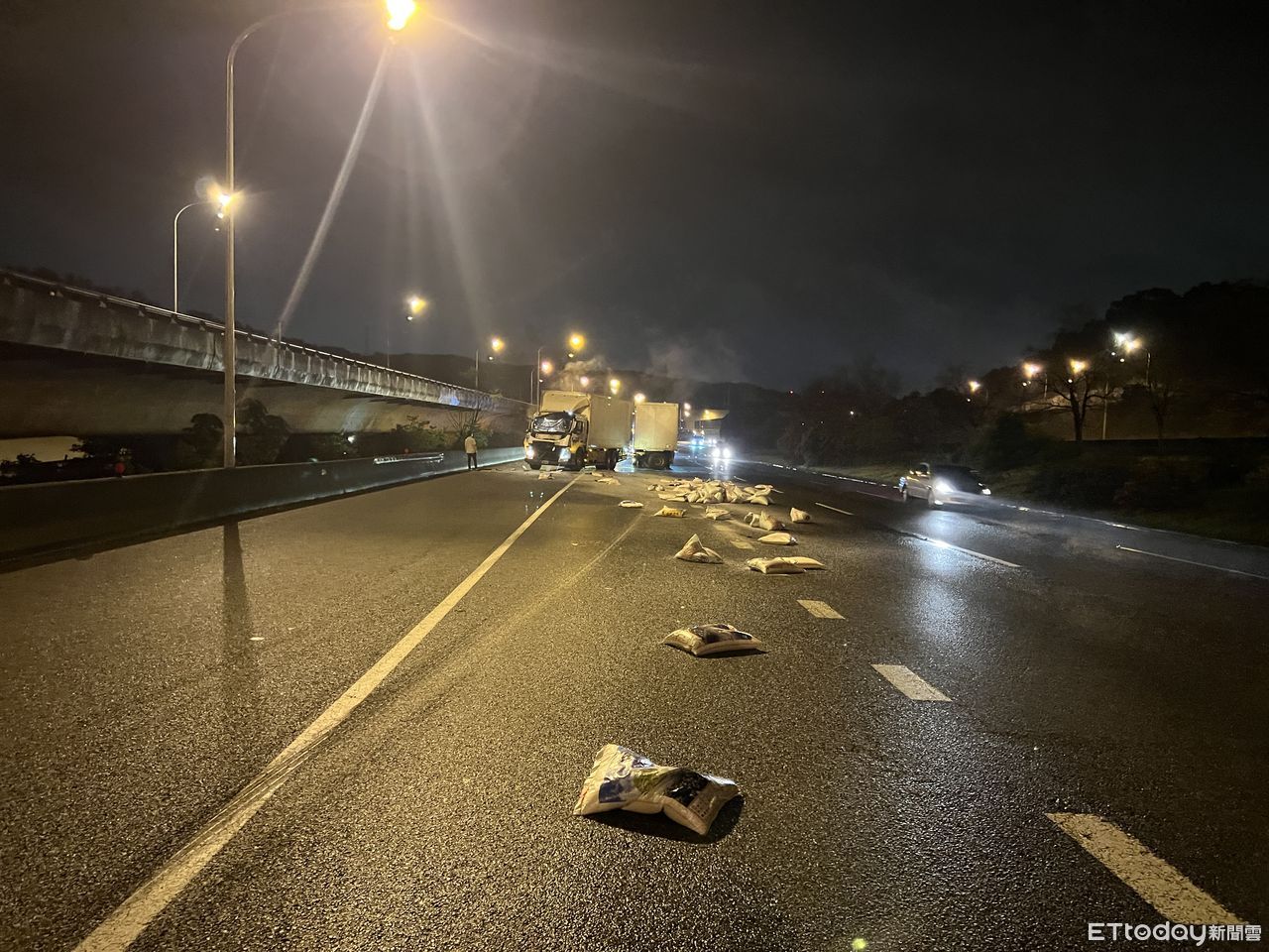 國道1號北向45.8公里林口爬坡路段12日凌晨2時43分發生2部聯結車撞擊事故,其中一輛聯結車黃姓駕駛輕微擦傷,經救護人員檢視無大礙,無須送醫。現場大量的白米散落在國道上,造成回堵3公里,一直到上班時段清晨6時38分才清理完成、排除恢復通車。