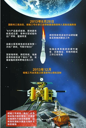 中國在2010年10月成功發射「嫦娥二號」衛星後,中國國家航天局在12日凌晨已將負責探月計畫第2步的「嫦娥三號」送至西昌發射場。這將是中國第一次在月球上站穩腳步,也是中國探月工程總體規劃的第二階段,預計以軟著陸的方式降落。