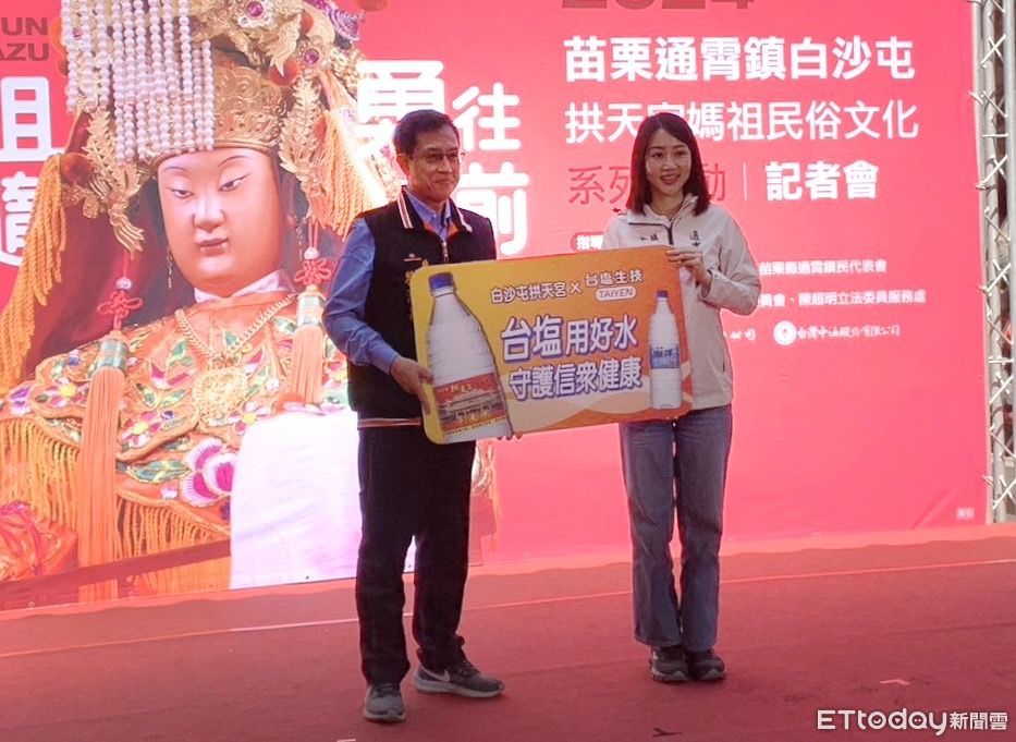 白沙屯媽祖進香鑾轎將於18日起駕,由通霄精鹽廠廠長劉鴻泉於記者會上代表台鹽公司贊助白沙屯媽祖進香活動台塩海洋生成水,供活動香燈腳飲用,並與苗栗縣長鍾東錦、通霄鎮長張可欣與拱天宮主委洪文華等幹部共同祈求進香活動順利。