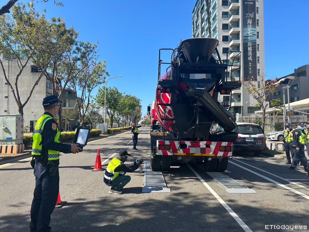 ▲台南市警四分局於3月12日上午10時至12時結合交通警察大隊在安平區永華路與平豐路口前設置「移動式地磅」攔檢大型車輛。(圖/記者林東良翻攝,下同)