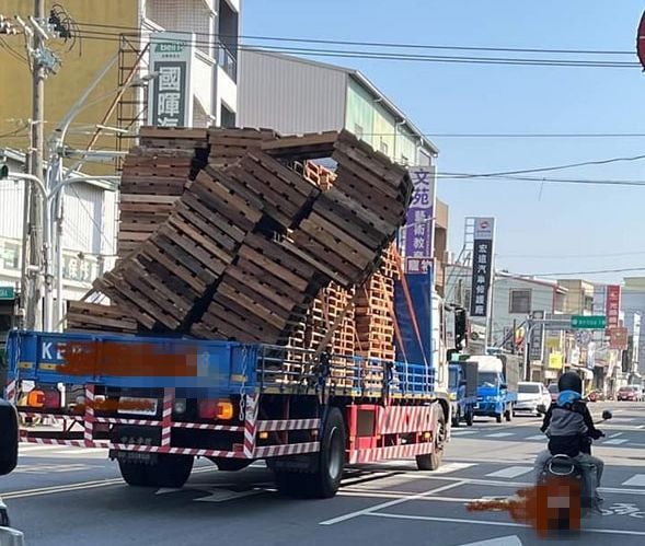 有網友在臉書社po出一張照片,並驚呼:「丫娘威…這是要嚇鼠誰」,只見照片中1部行駛在台南市仁德區中正路二段的大貨車,上面載運的整車建築棧板,後方數十片棧板已傾斜出車身貨櫃外,只靠繩子綁住,快倒塌了,一旁還有機車,相當危險;歸仁分局指出,初步檢視該車違規行為明確,將調查後依法舉發。