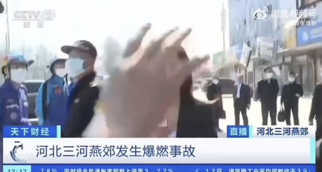 燕郊爆炸案發生後,外界十分關注搜救及現場情況,《央視》北京總台也派出記者楊海靈到現場連線,就在記者敘述情況時,突然間看到身著黑衣的保安人員開始躁動叫人,緊接著鏡頭就越來越歪,數名保安一擁而上擋住鏡頭,整個連線也因此中斷。