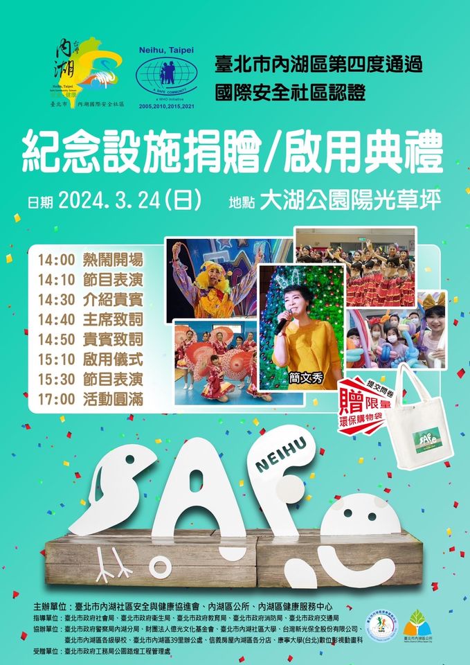 協進會與內湖區公所及內湖區健康服務中心特別訂於今年3月24日(日) 下午2:00-5:00,假大湖公園陽光大草坪舉辦「臺北市內湖區第四度通過國際安全社區認證紀念設施捐贈/啟用典禮」公益活動,歡迎大駕光臨,共襄盛會。