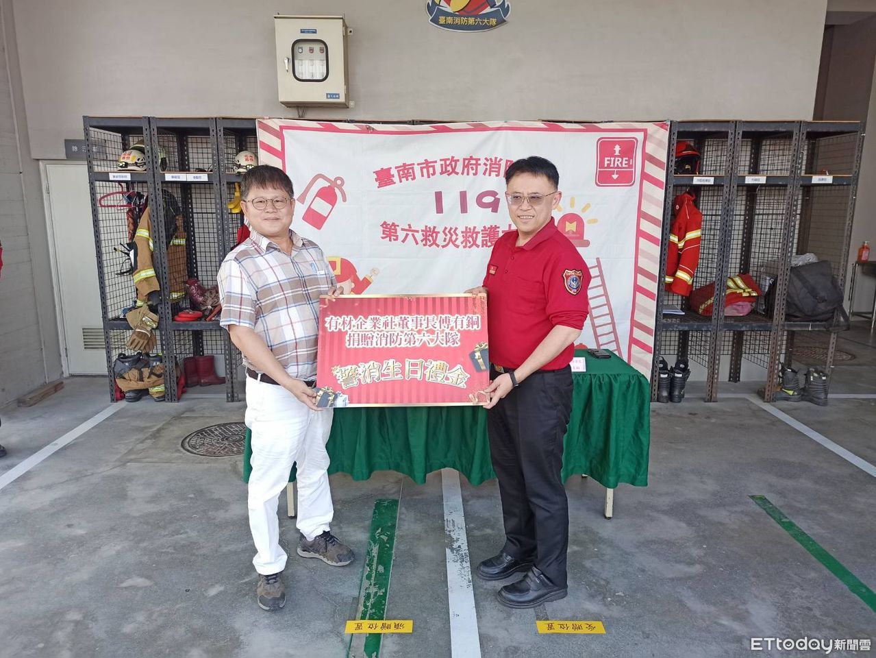 ▲台南市消防局第六大隊18日,辦理有材企業社董事長傅有銅捐贈生日禮金儀式,由六大隊長邱淵明代表受贈,並回贈感謝狀,以表達對其支持的誠摯感謝。(圖/記者林東良翻攝,下同)