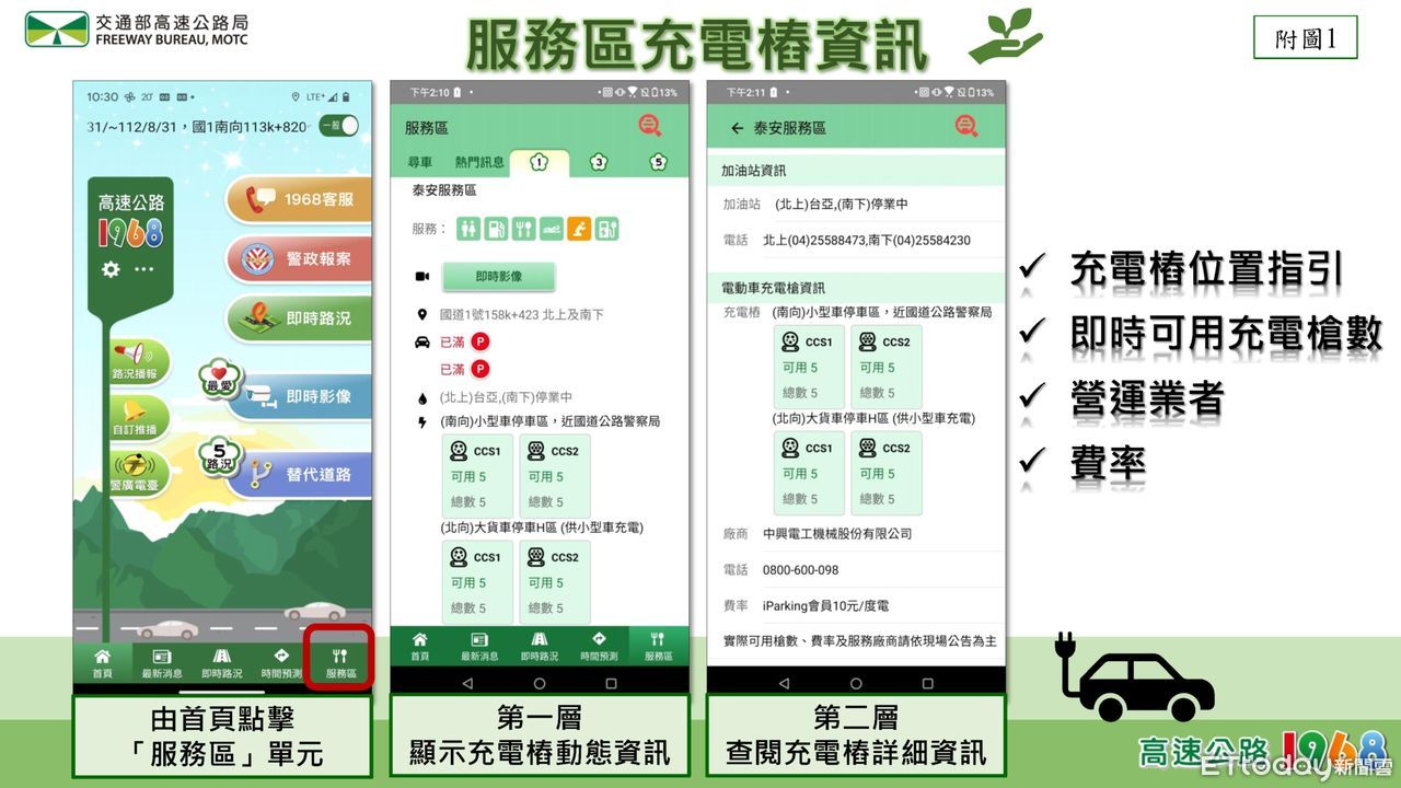 ▲高速公路1968 App精進功能可查停車位和充電樁。(圖/高公局提供)
