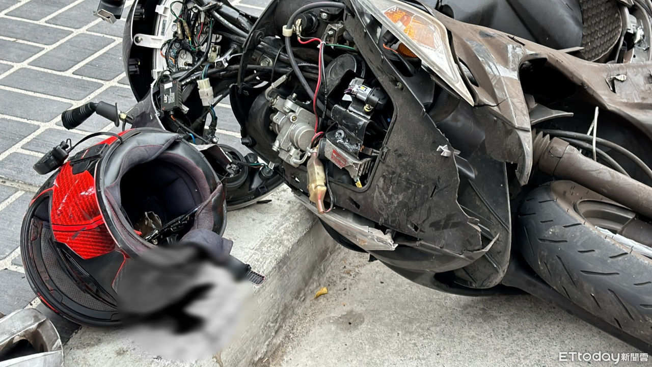 ▲機車車頭幾乎全毀,據悉,事故地點離男大生住處僅不到5分鐘車程。(圖/記者許權毅攝)