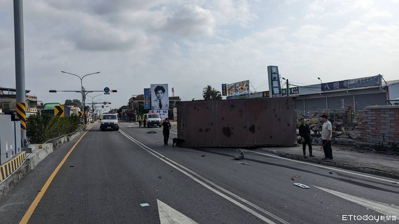 屏東縣今(15)日下午發生一起離奇連環車禍!一台砂石車行經新埤鄉台一線與新民路口時,為閃避前方一台突然滑倒的機車而急煞,連帶使得後方第二台砂石車左偏閃避而衝過分隔島,再撞到對向車道一台貨櫃車,導致貨櫃掉落外線道,第二台砂石車再衝向路旁店家停車場圍牆,造成圍牆倒塌,駕駛也重傷命危送醫搶救,至於機車騎士則幸運僅受擦傷送醫,全案相關肇事原因,由警方進一步調查釐清。