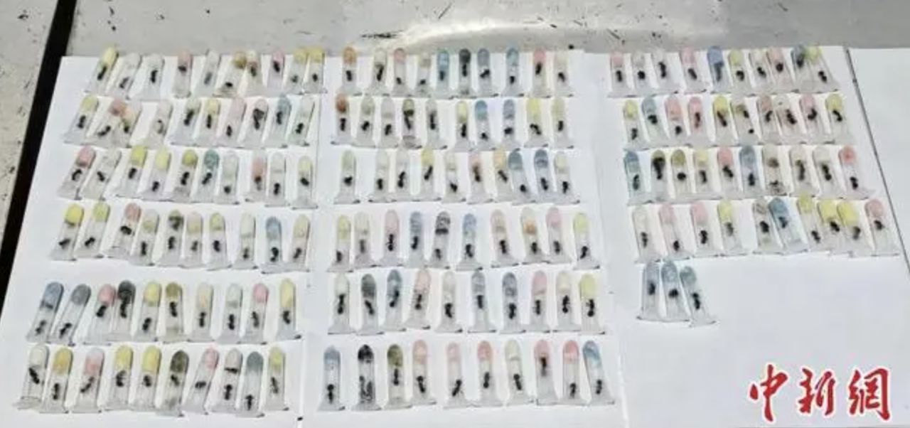 《環球時報》報導,經現場查驗,關員發現該名男子腰腹位置用膠帶纏裹著大量指型離心管,每個指型管均單獨存放一隻活體螞蟻,管內墊有保濕棉花,管口留有通氣孔,共計163隻。經鑒定,該批螞蟻為異寵野蠻收穫蟻。目前,案件正在進一步辦理中。