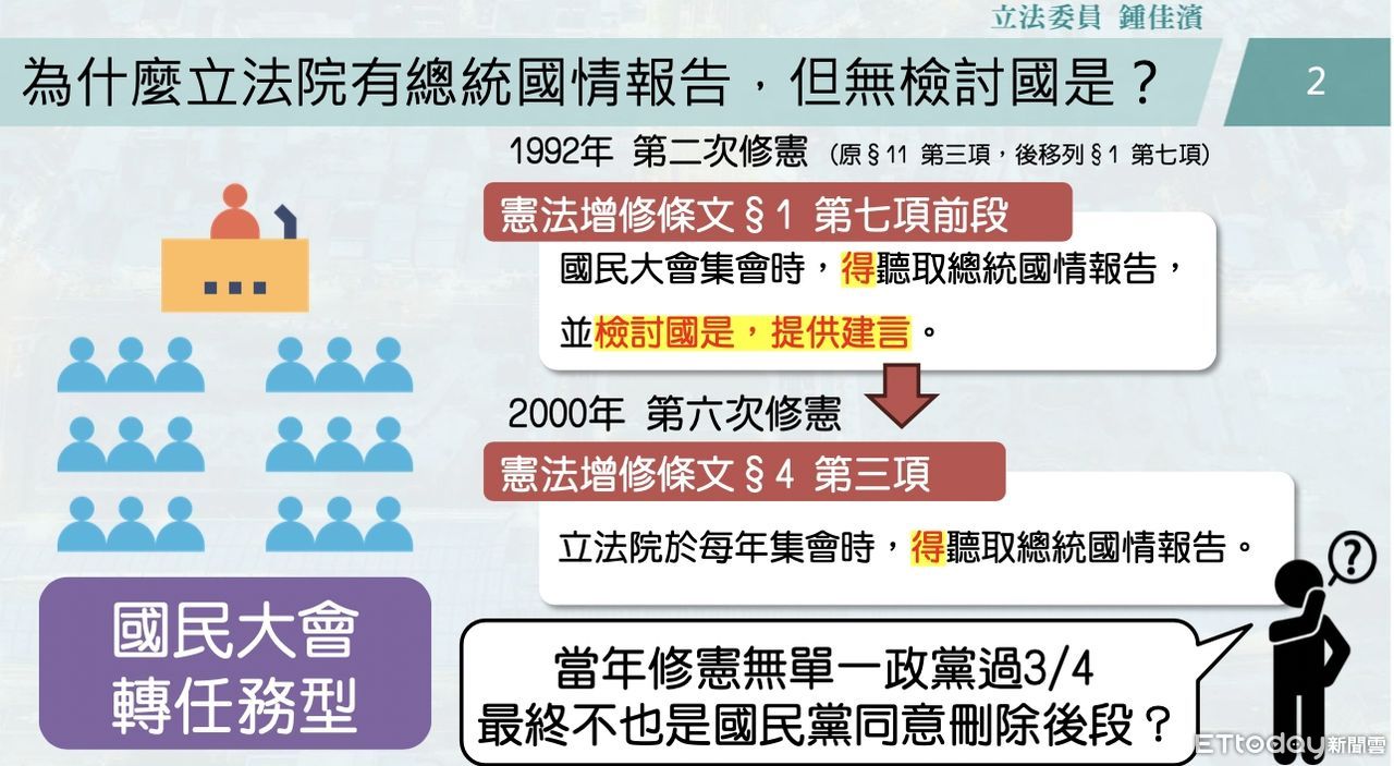 鍾佳濱質詢時搬出憲法說明,相較於1992年第2次修憲,2000年第6次修憲時,規定立法院於每年集會時,得聽取總統國情報告,拿掉「檢討國是,提供建言」八個字,當年修憲無單一政黨過四分之三,也是經國民黨同意才刪除後段,而李登輝曾到國民大會提出國情報告,但並無答覆。