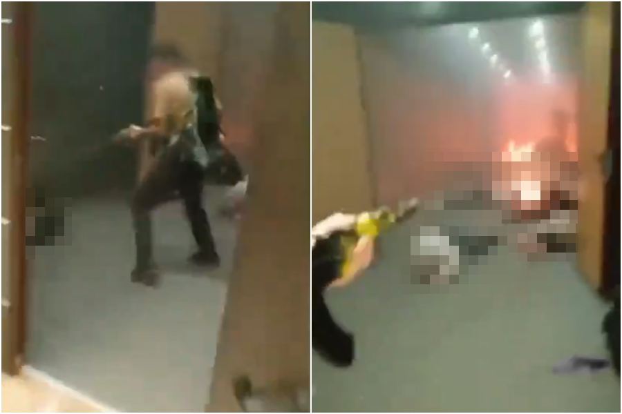 ▲ ISIS公開作案畫面,可見犯嫌持槍狂射,遠處燃起大火。(圖/翻攝自X)