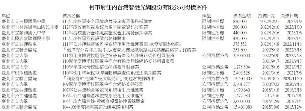 ▲柯市府任內台智光得標案件。(圖/台北市議員柳采葳提供,點圖放大)
