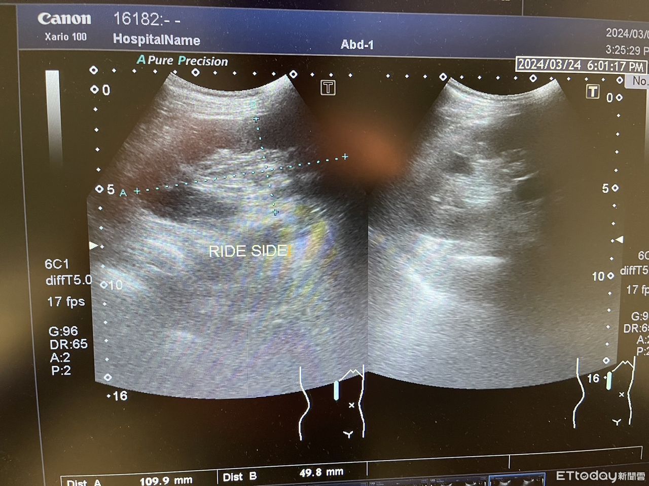 ▲右邊腎臟上面應該要有肝臟,但是超音波顯示卻沒有。(圖/記者吳奕靖翻攝)