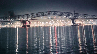 海岸警衛隊稍早證實,凌晨1時27分獲報發生意外,一艘懸掛新加坡國旗的貨船達利號(Dali)撞上這座橋。實況影片可見,該船幾乎直接朝其中一座橋墩前進,疑似快撞上前才稍微轉向,但已經來不及,發生撞擊後橋面在10秒內斷裂成至少4截,墜入水中激起大量水花。